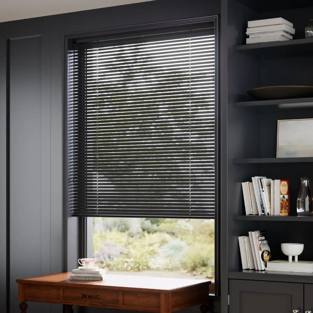 Our options include sunscreen, blackout venetian blinds, and semi-transparent slats that are adjustable for light control.